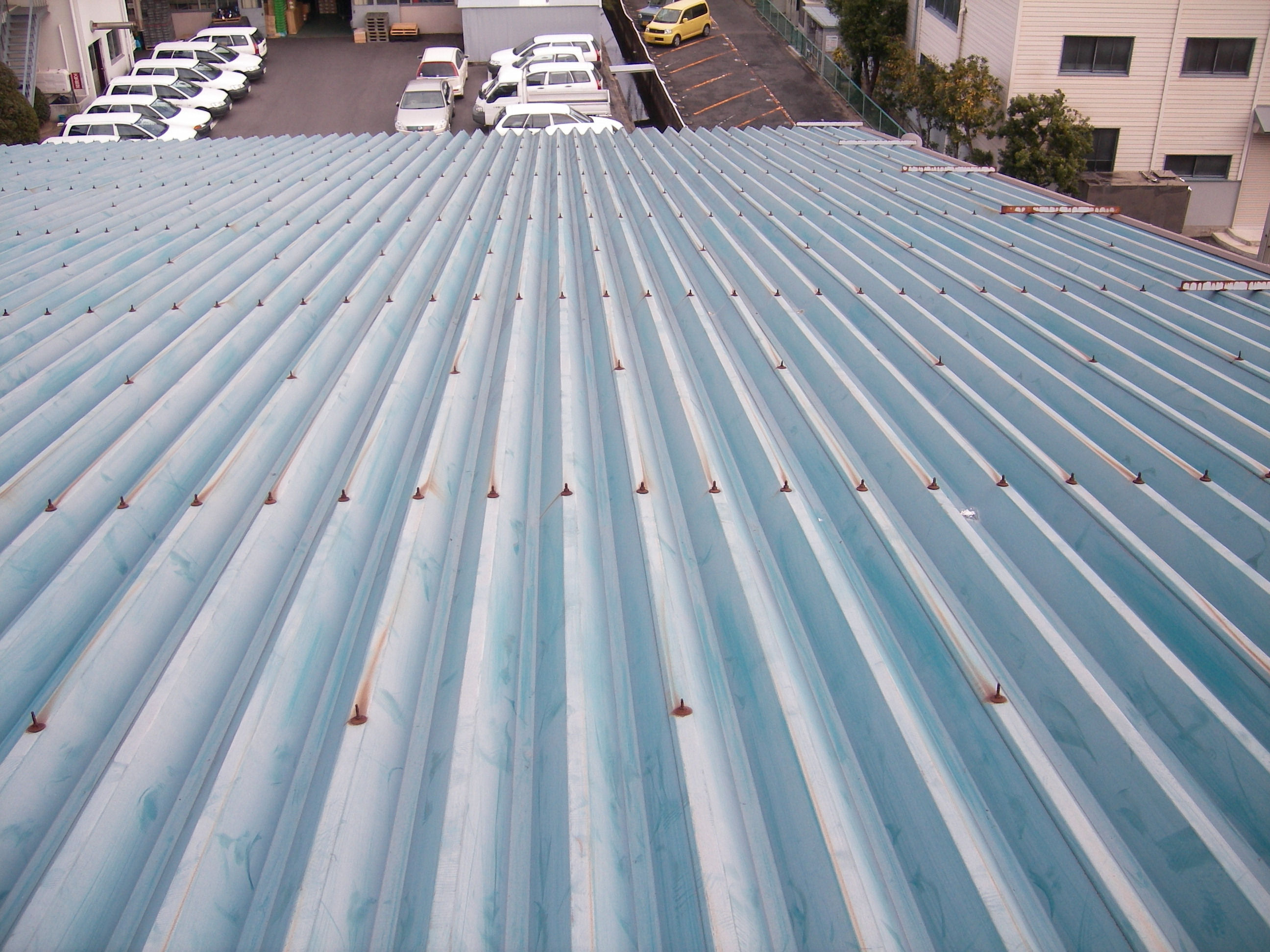屋根は15年以上何もされていませんでした。全体に色あせが激しくボルト部分はサビが発生しており。全体に劣化が進んでるといった印象です。工事着手までに現場調査を繰り返し行い。節電対策、熱中症対策を中心に施工計画を立てて着手しました。